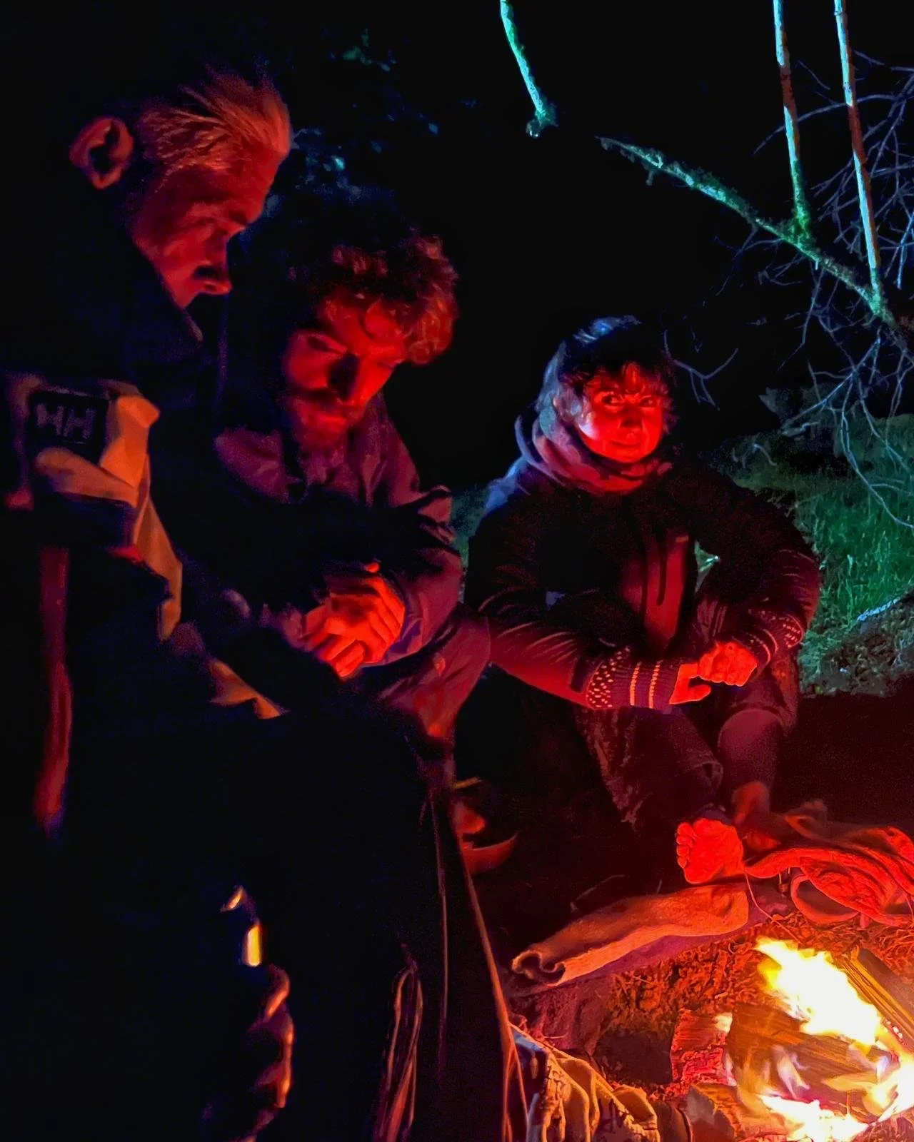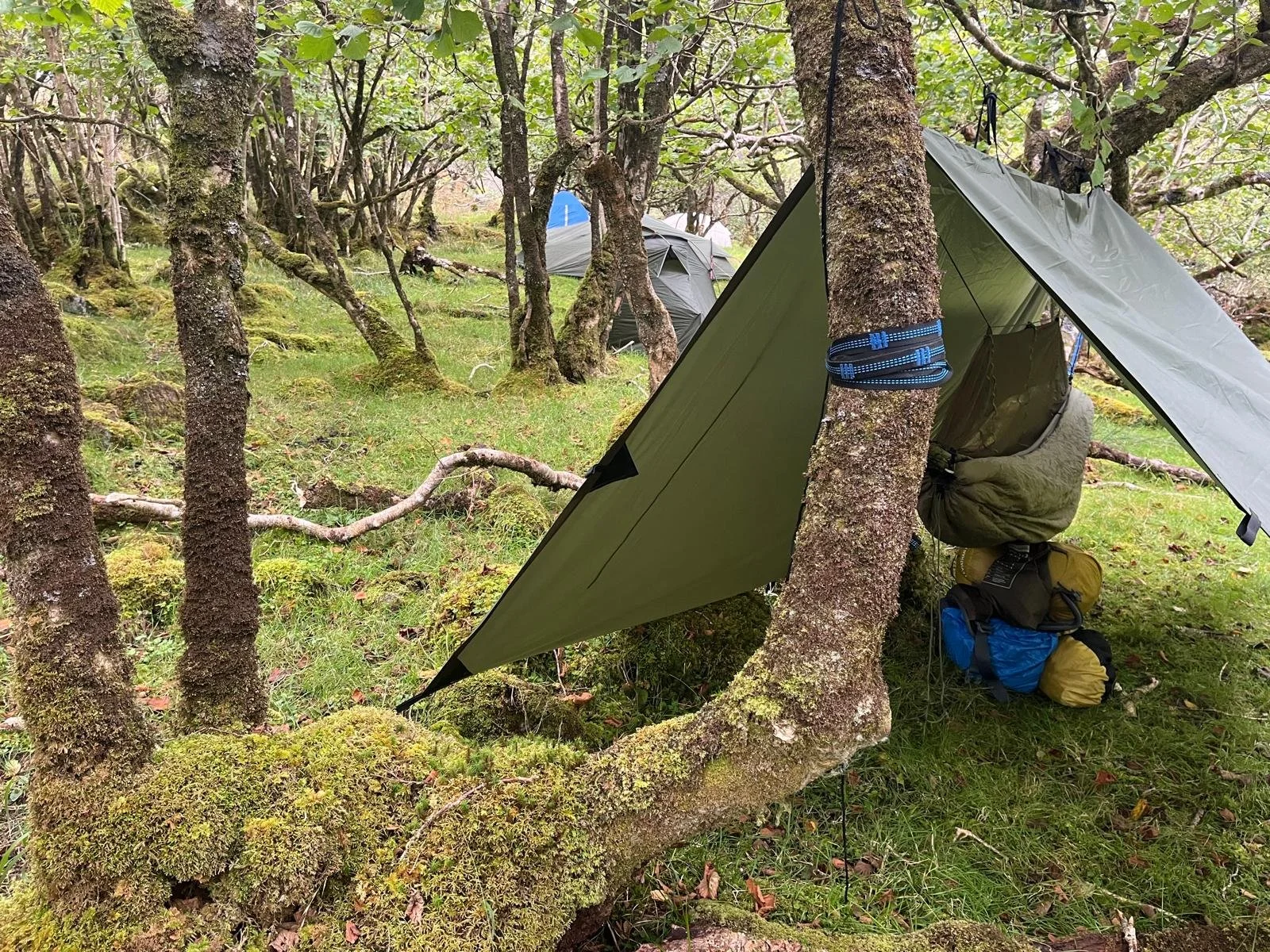The other Skye angel’s knowledge of the land had taken us to where we could pitch our tents in a wooded hide away from the winds. That evening - after eating food cooked in the huge pot - we were faces round the fire beneath the young hazel woods low tangled branches. Sleep came fitfully in the pouring rain. The next morning we woke to begin it all again.