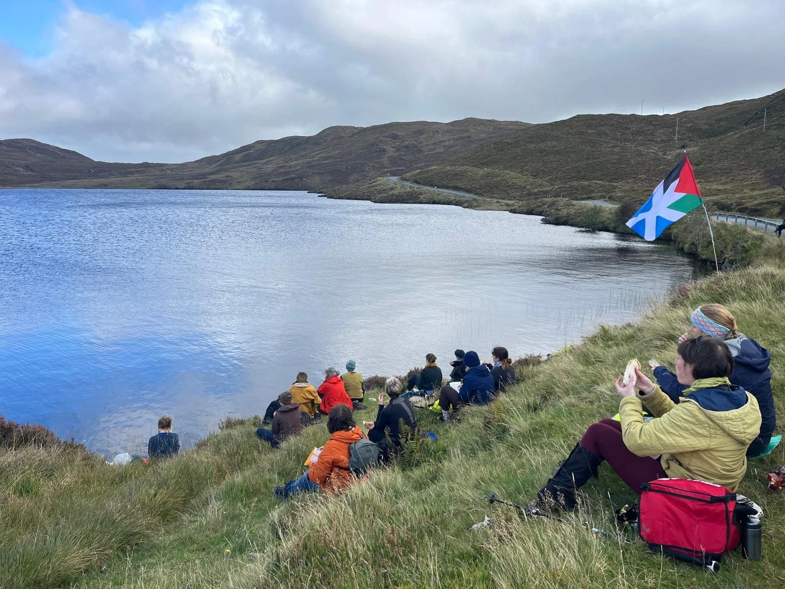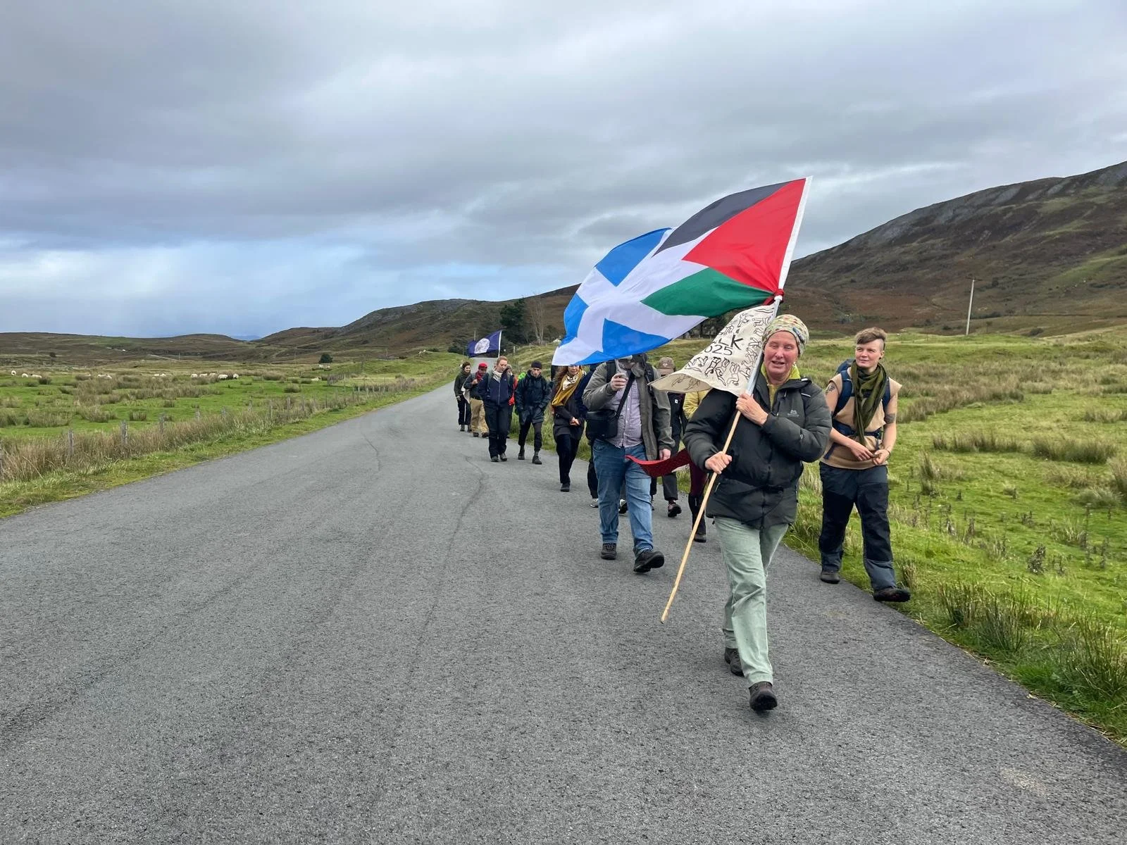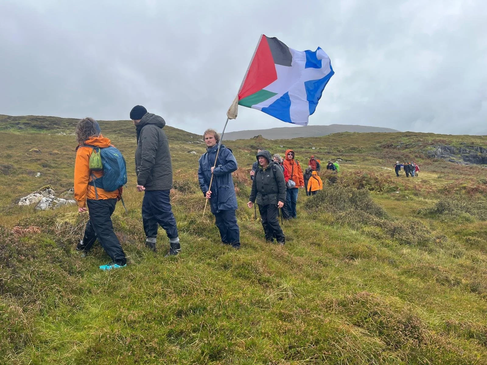 We walked the path behind a Scotland-Palestine flag (land justice anywhere empowers land justice everywhere) and at the back an earth flag shepherding us (we need no borders to our belonging).