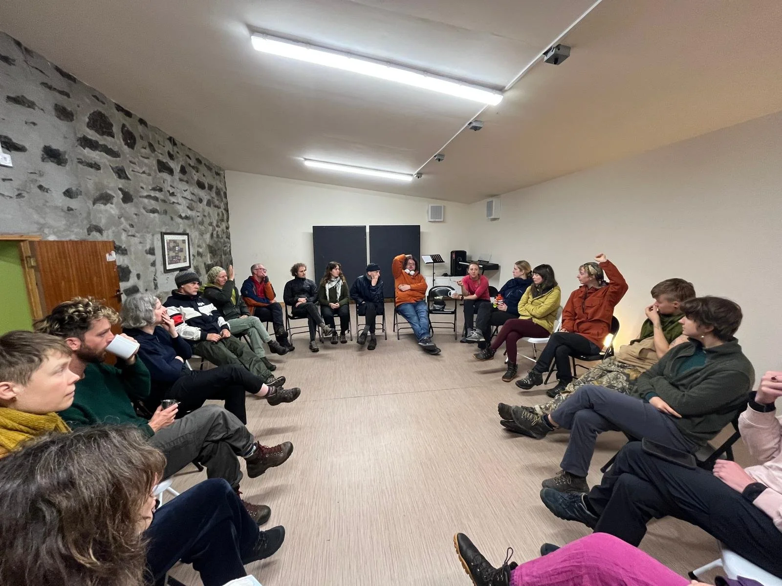 We held a circle in the studio in Broadford, planning how to manage now that - after months of warm dry weather - this, the first day of the walk, was going to become awash with high winds, lashing rain, and increasing storm. Lorraine said it been the first day for months she’s had to wear full weatherproofs.