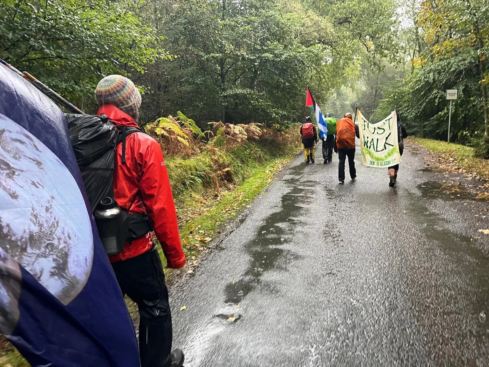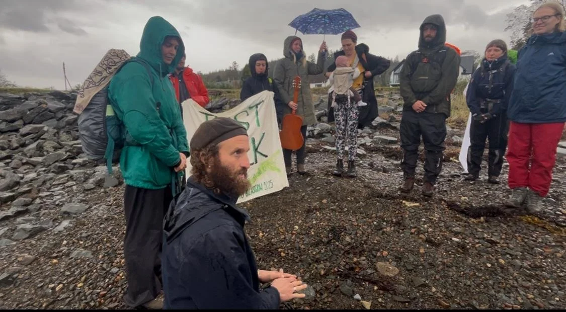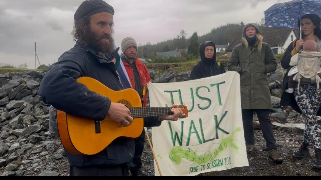 After the Corran ferry we walk in pouring rain on the pavement, with vehicles honking their support (and only one doing a v sign against us). Suddenly 2 cars pull in and Lorraine jumps out of one with a jacket for Gabs (Lorraine is on her way to Ireland) and Mike (who later sorts the gas cooker in the evening, and extends the gazebo side so we can have a bonfire despite the pouring rain). One of the new women we walk with has a wee baby, Nadia, strapped to her front, and talks of the need for community ownership rather than private or state ownership of land.
