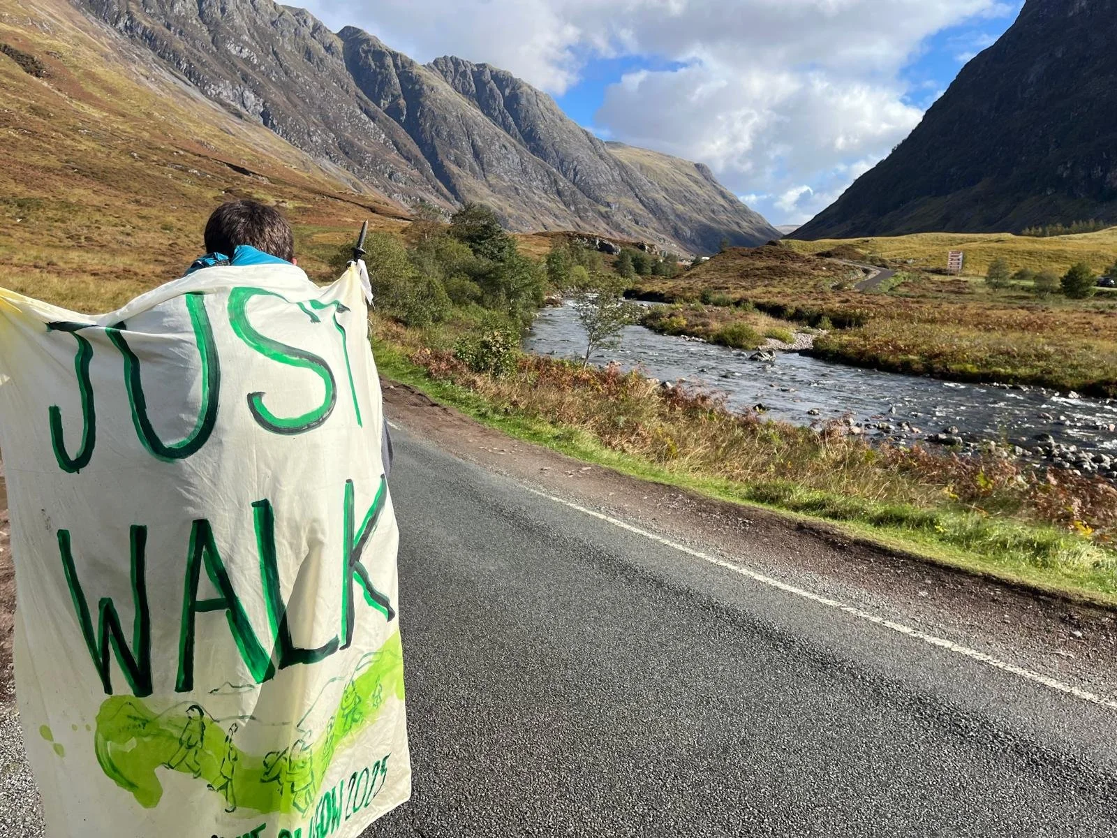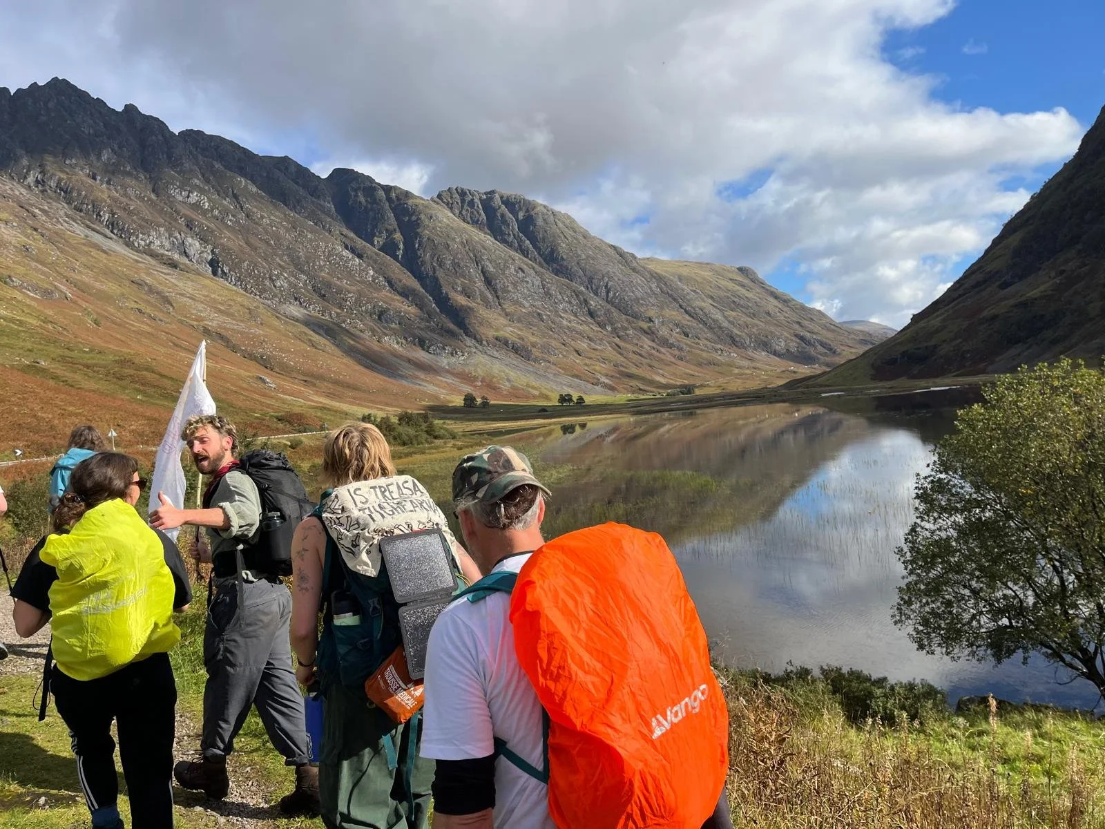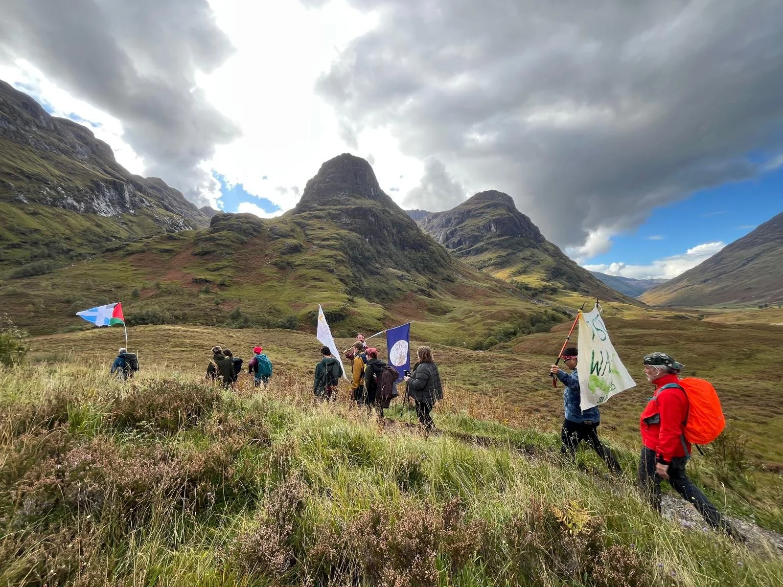 Our flags and banners receive a huge amount of supportive honking of horns (and on or two virulent objections) on a wet wind-lashed walk to Ballachulish and on to the Red Squirrel campsite at the start of Glencoe.