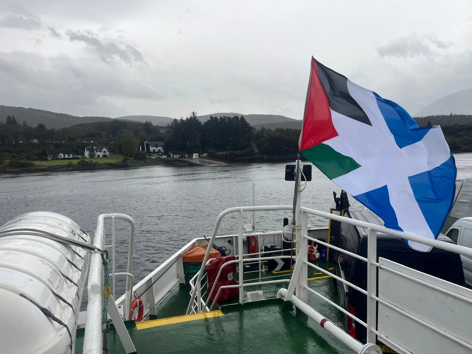 Before we reach the ferry, we can’t help but stop at Ardour Ales for tea and coffee and bacon butties and much much more. It is Wapat’s 30th birthday and we help him celebrate with a bacon, egg and black pudding roll. As we finally walk on towards the ferry we pass the industrial salmon farm with the wooshing sound of feed being pumped out from the shore, apparently accompanied by the release of a host of microplastics.