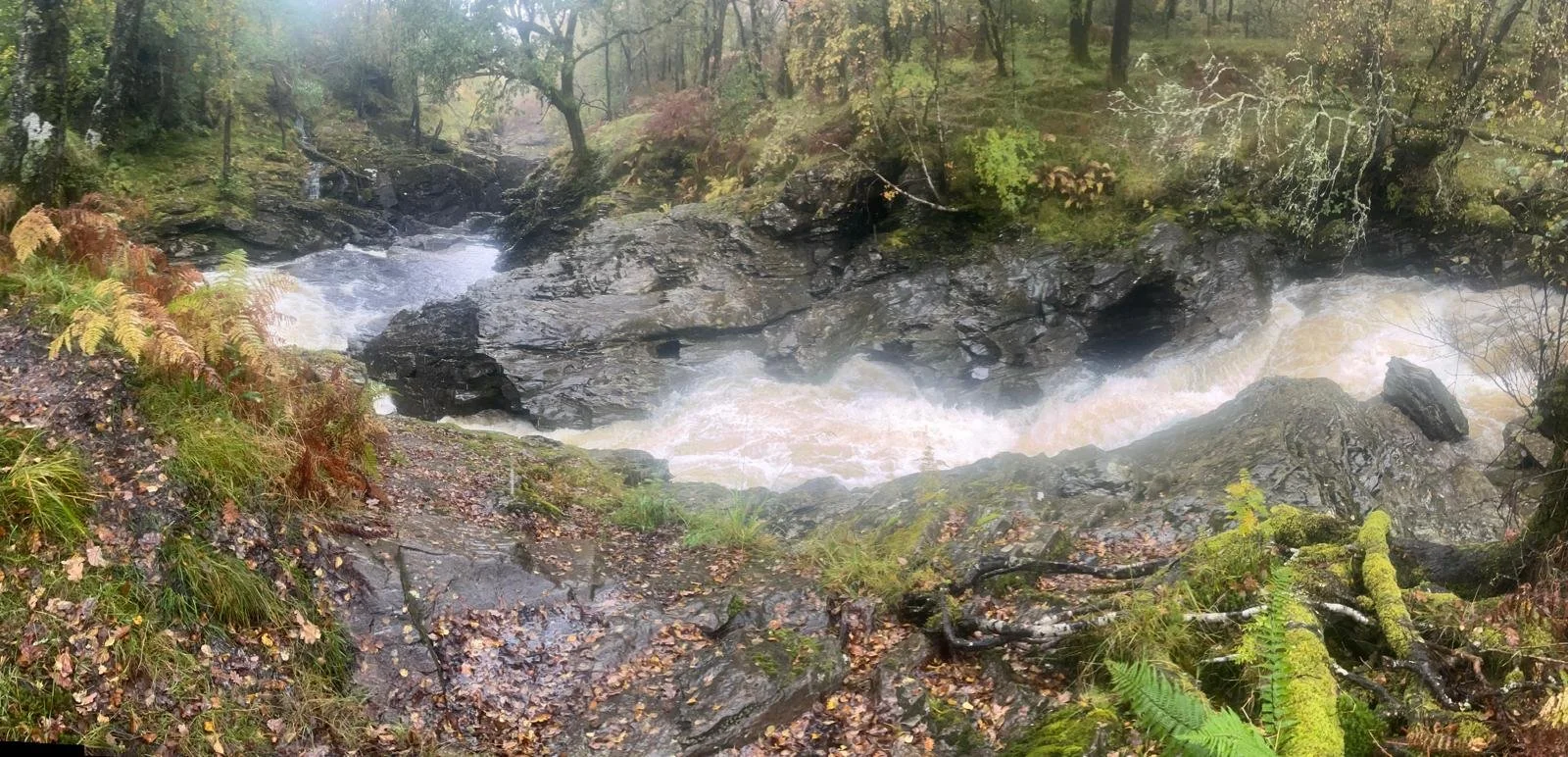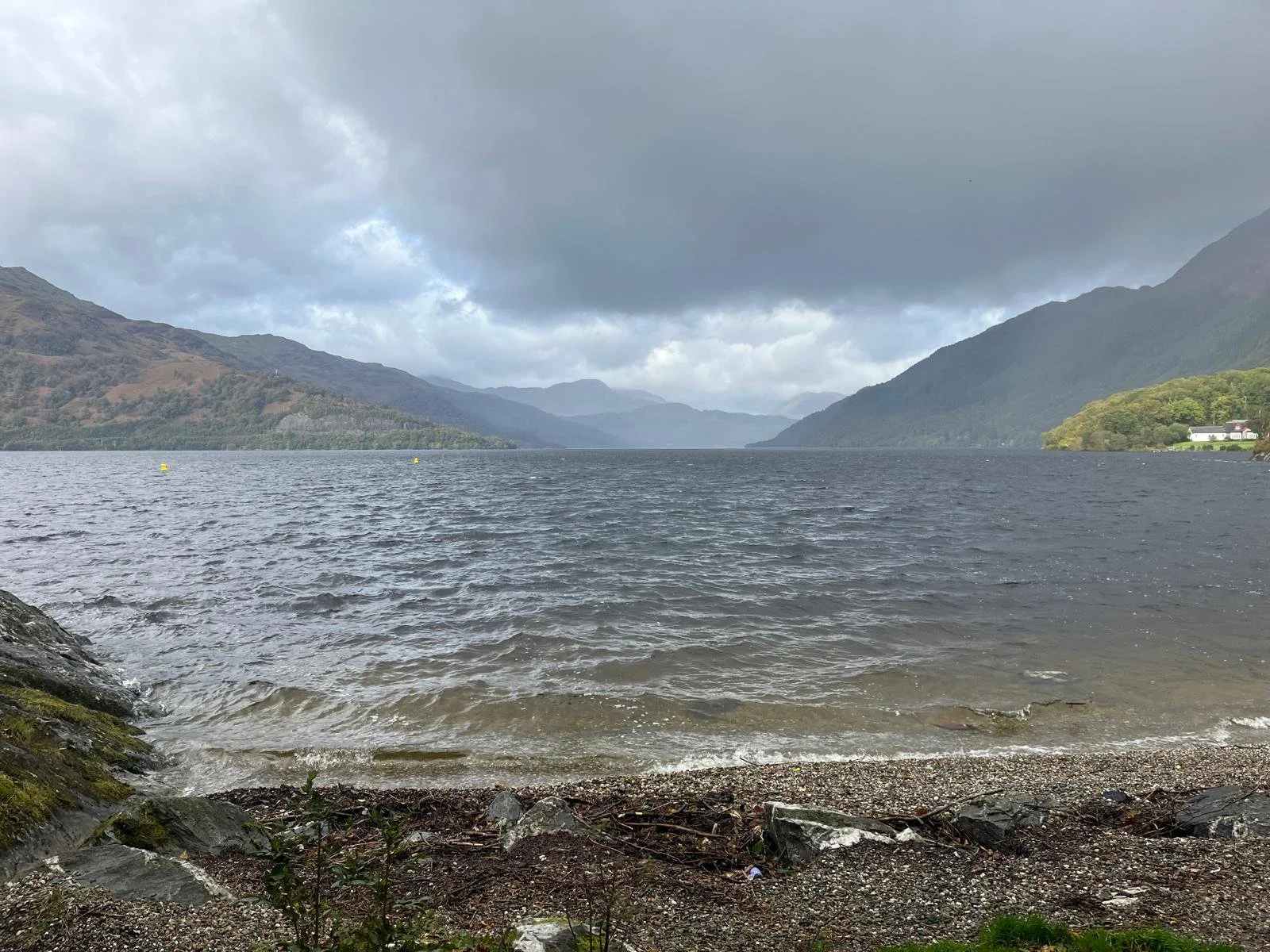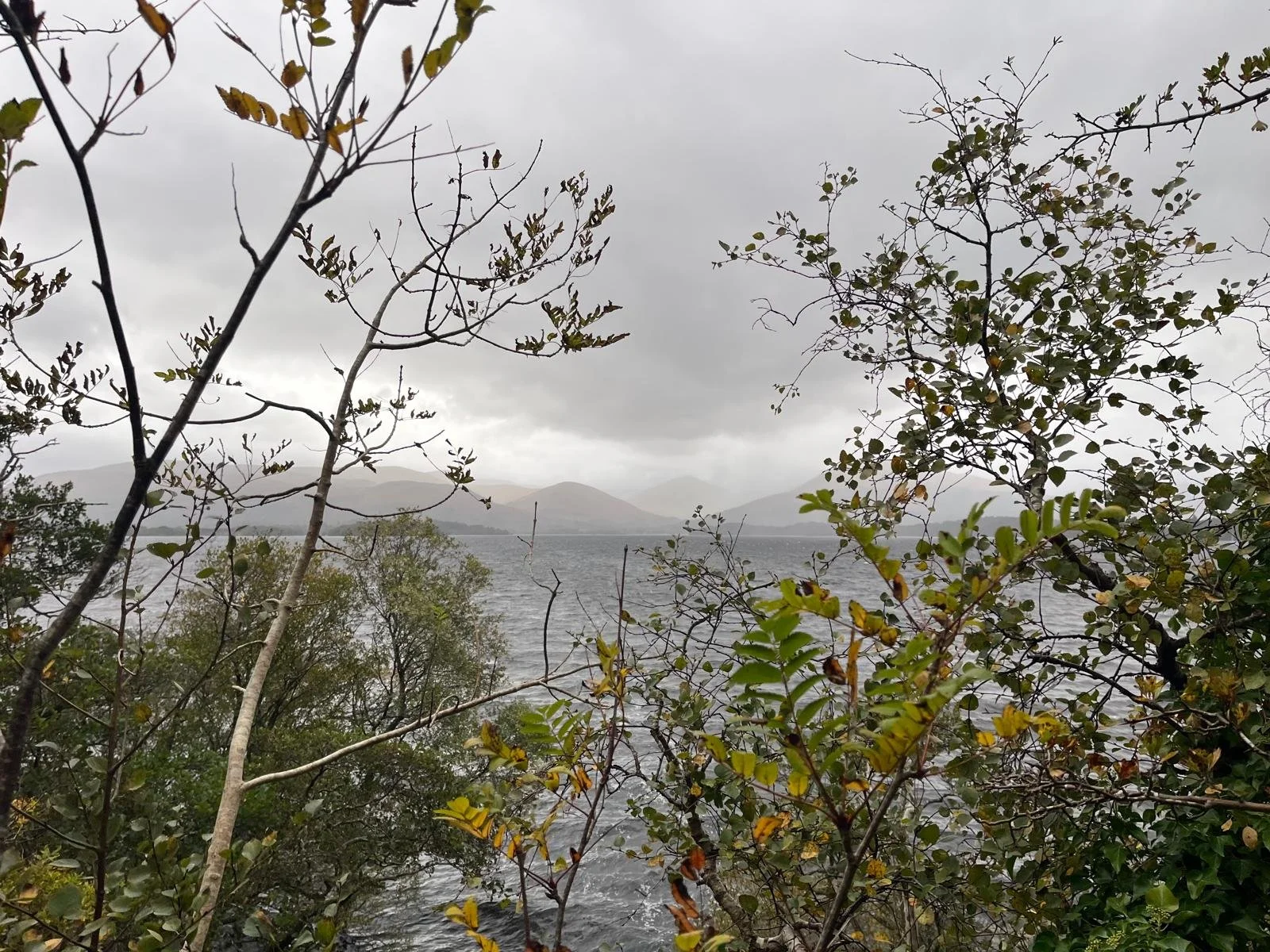 We walk on through the forested rocky hillside as the rains increase. The winds start to play with the trees as if they are dance partners being flung in an eightsome reel, and the waves of the loch crash just to our right, as if they were Atlantic breakers having crossed an ocean.