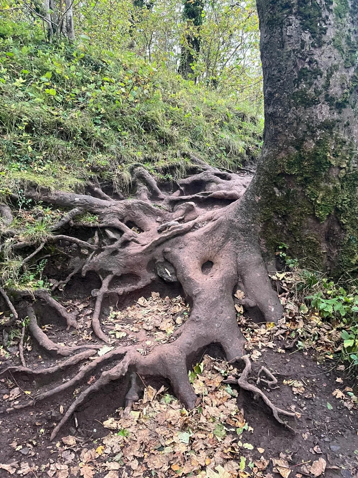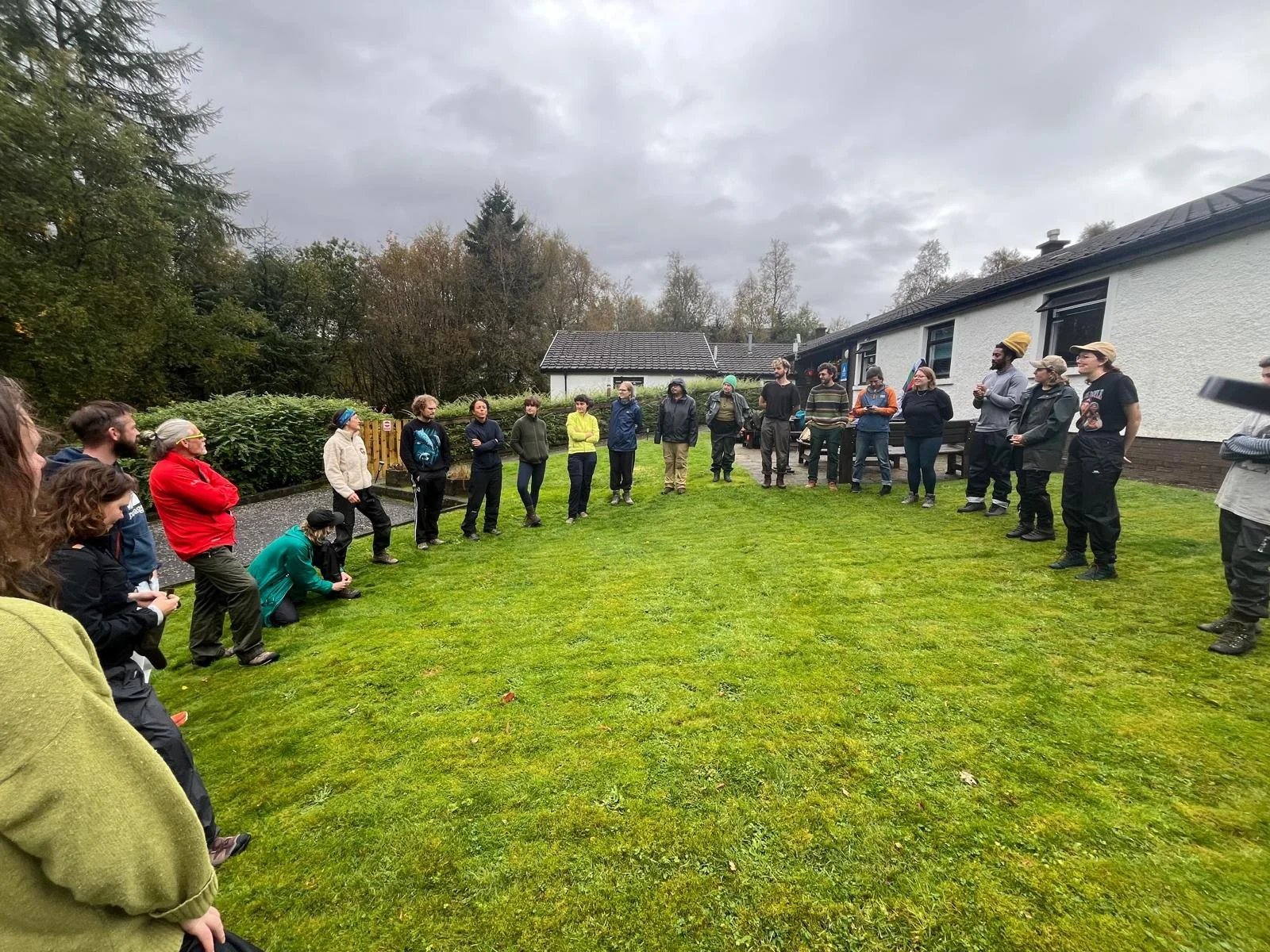 21 folk gather in the circle on the lawn outside the Youth Hostel, preparing to walk for the day. Practicalities of route and roles get sorted, with 3 folk joining us only so far as the head of Loch Lomond where they’ll leave us to catch a bus to Glasgow, before we begin the path that will snakes wet and flooded, up and down, through trees roots and rocky slopes.