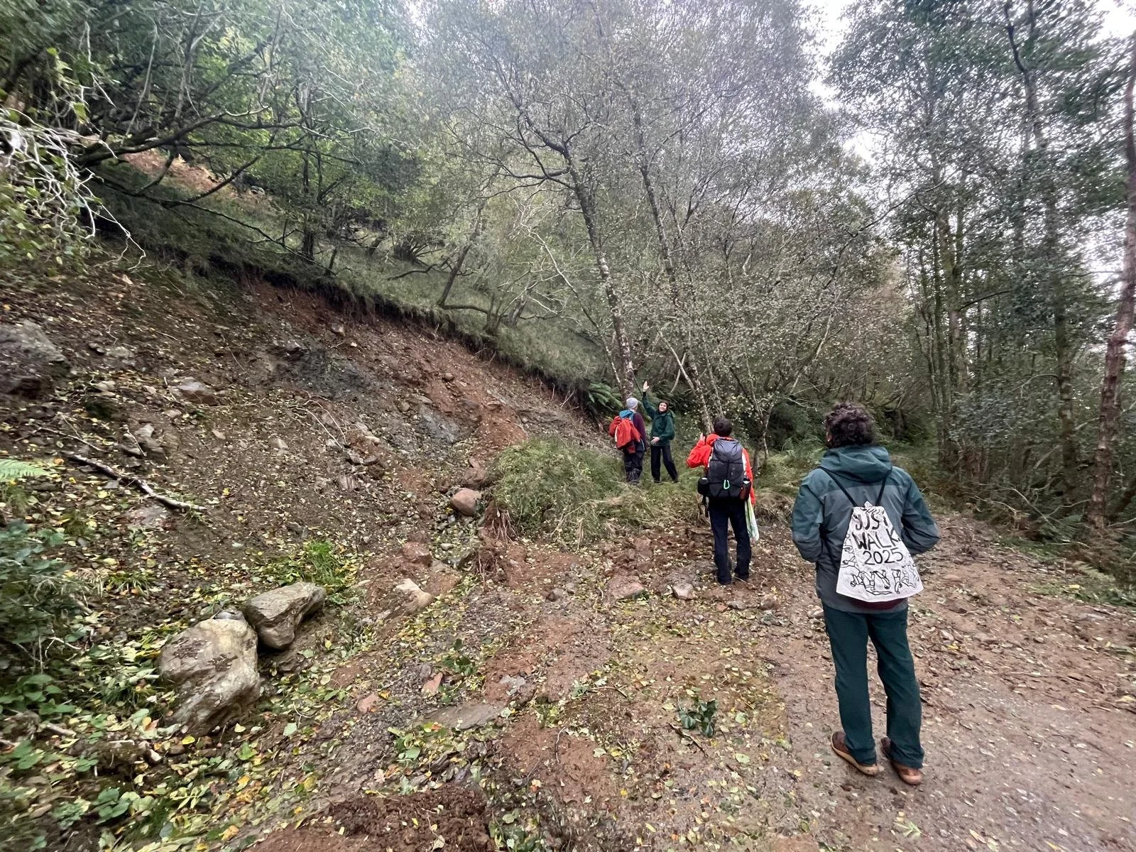 We pass an extraordinary happening: there has been a landslide where the ground has become so wet that a tree has slid down the hillside with its roots intact, still gripping an island of wet earth, grass all round it, still standing tall in the midst of a mud slide.