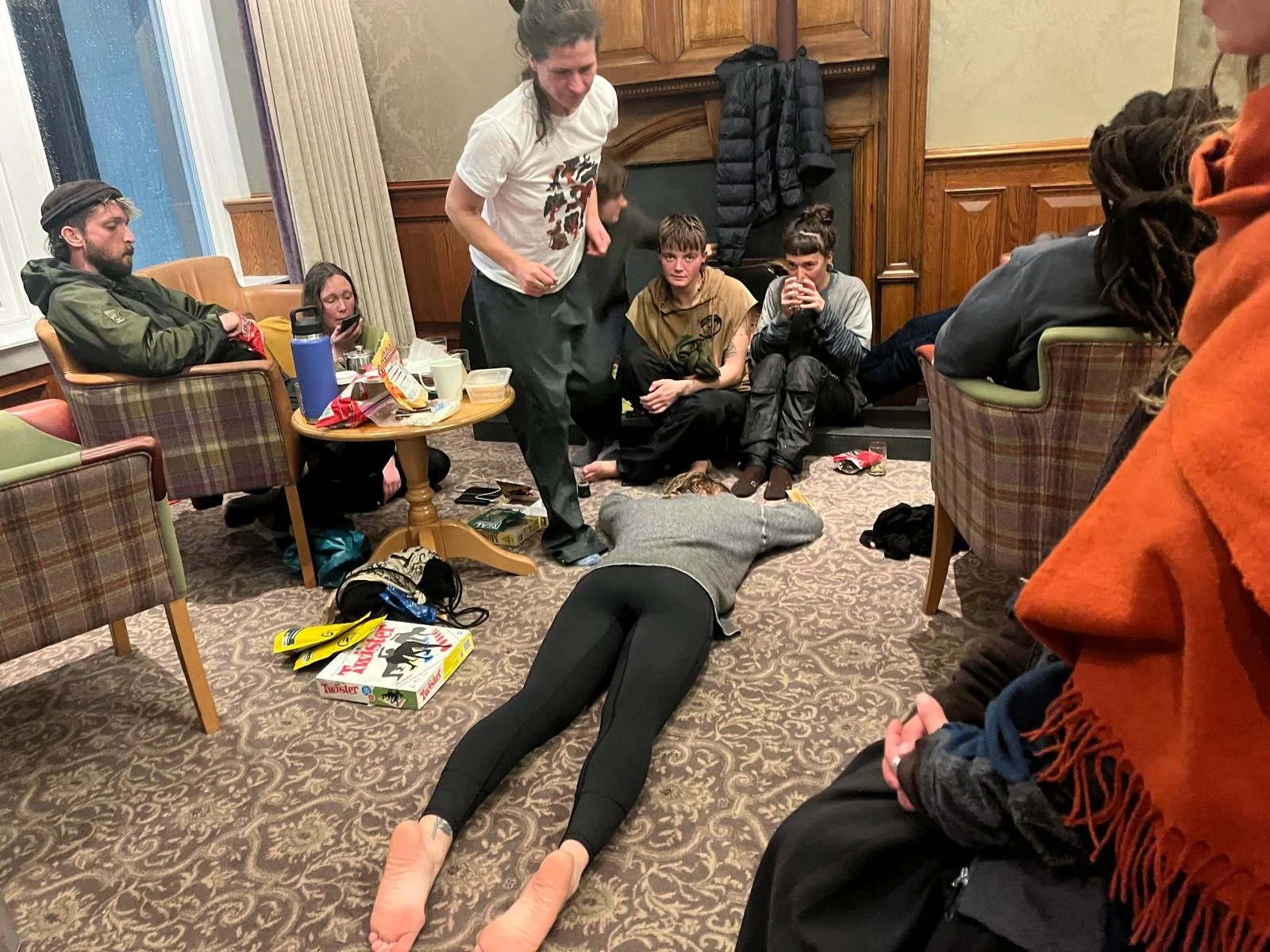 Later a strange thing happens, a few of our group head to a nearby big big hotel that has a swimming pool and sauna. A man working there is so taken with our story of being treated badly at Inversnaid and so well in this community, and he is so keen on the community buy out and sees us working for the same cause, that he invites us all to stay the night for free in three lodges (each of which sleep 8) which have water damage so can’t be rented out. Later it transpires he’s soon climbing to the Everest Basecamp for charity.