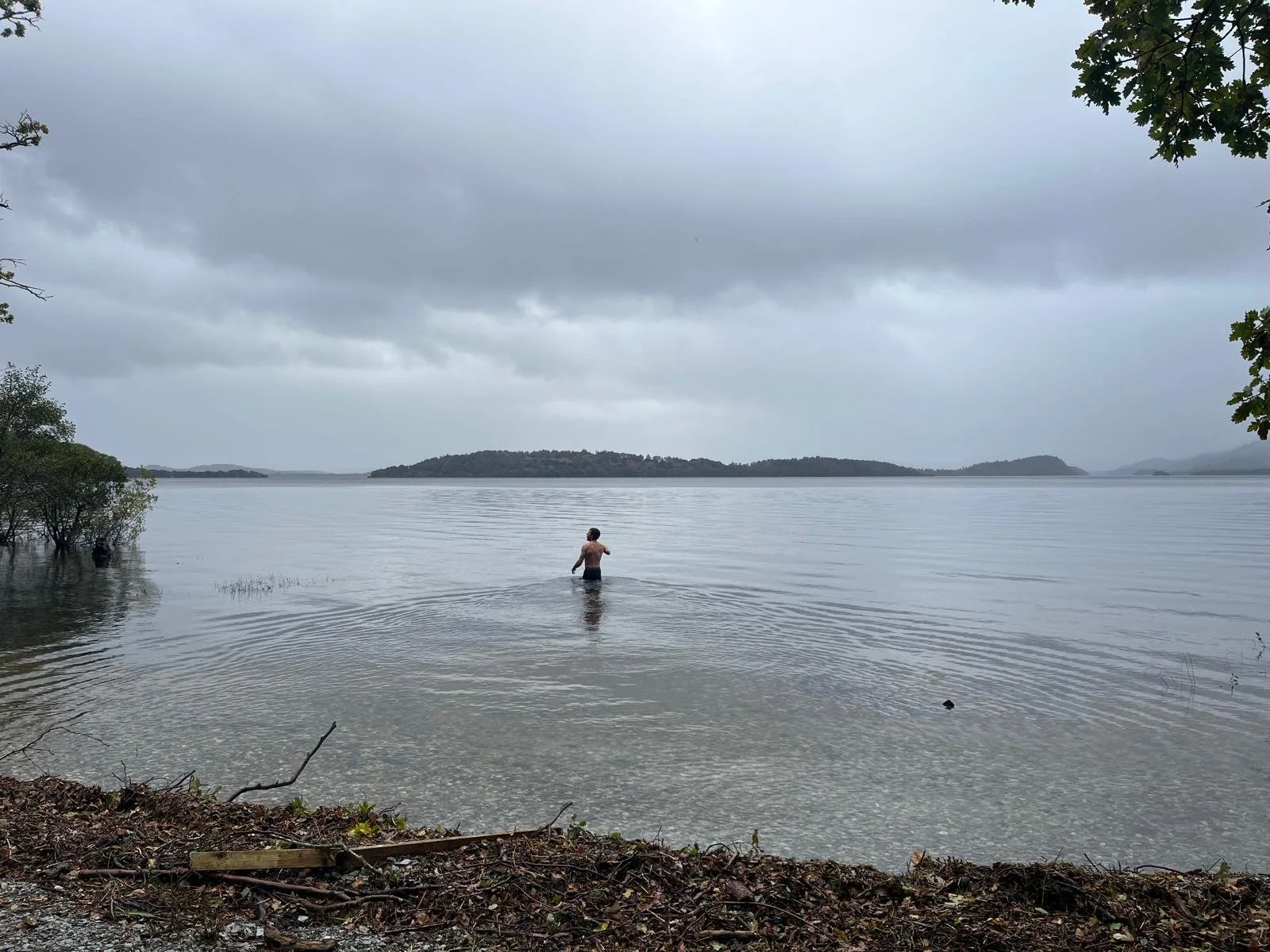 There are major pauses for mushroom hunting, for a cascade of skinny dippers to pour into the cold loch, and all the day the rain is pouring on the far side of the loch but never crosses to us.