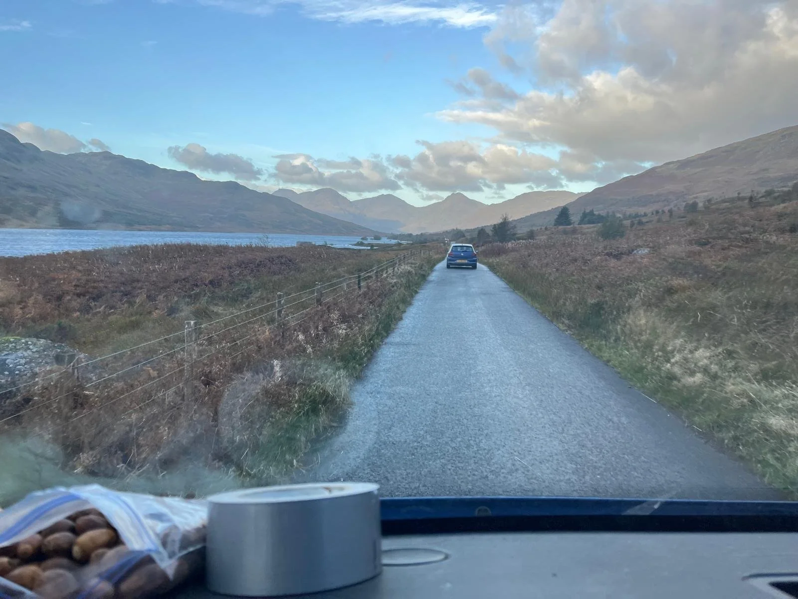 We drive on to check ahead, passing all the places where the local man chainsawed through many other fallen trees, and find the road clear. Returning, everyone piles on board, and we head to Kinlochard Village Hall.