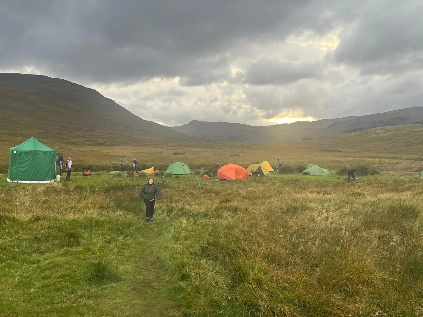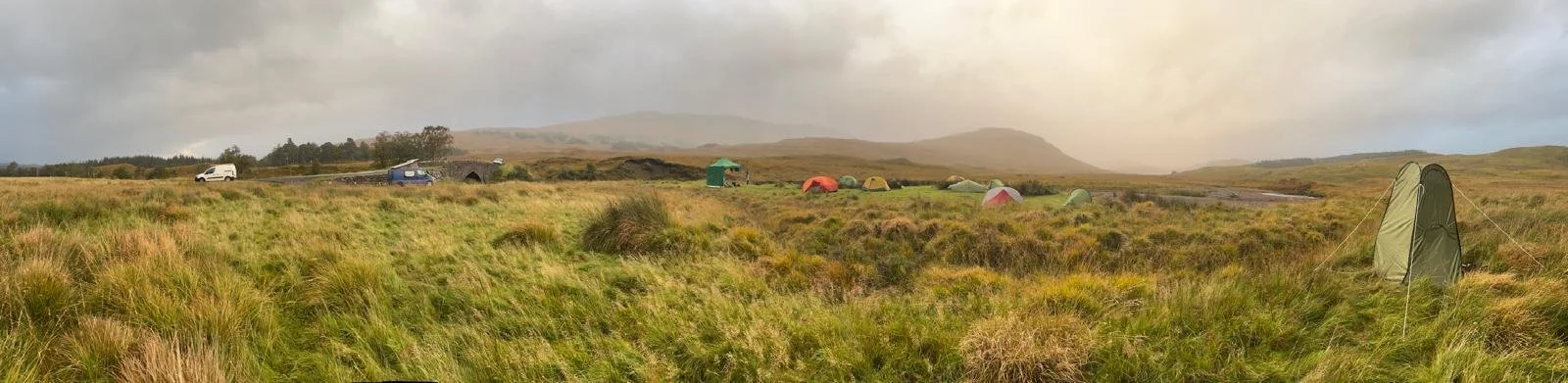 We wended through the misty boggy moorland full of islands in the lochs, then set up camp (gazebo, toilet tent, tents) before waiting in the friendly Bridge of Orchy hotel. A cleanly place perfectly welcoming of muddy walkers.