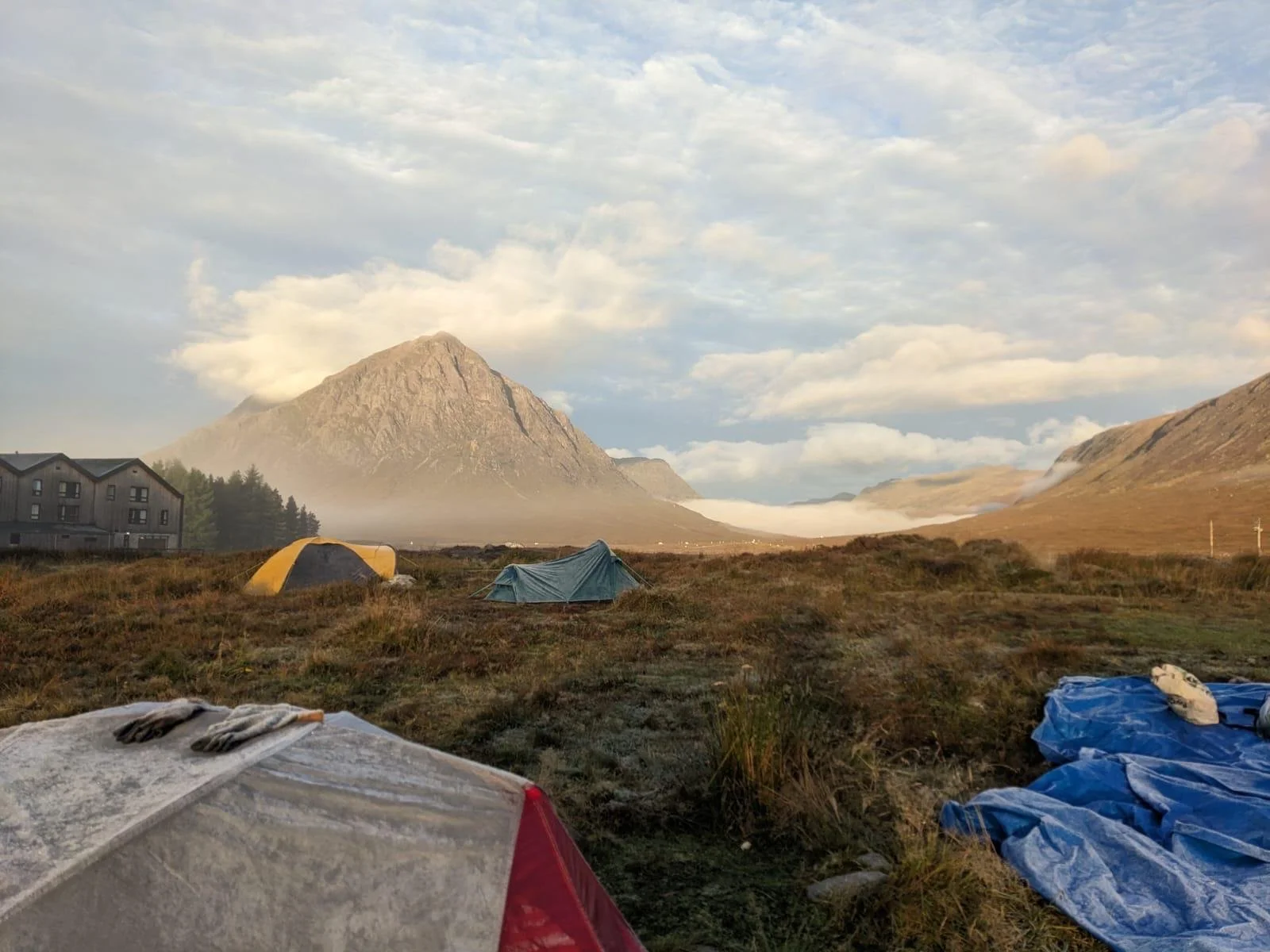We had camped just over the wee bridge behind the pub and hotel at Kings House, just beyond the ‘No Camping’ sign. It was totally weird being so close to a swanky £390 a night hotel, and even weirder that the staff were so friendly, so used to muddy camping walkers frequenting the pub, and then passing through it into the swanky hotel to use the warm warm toilets.