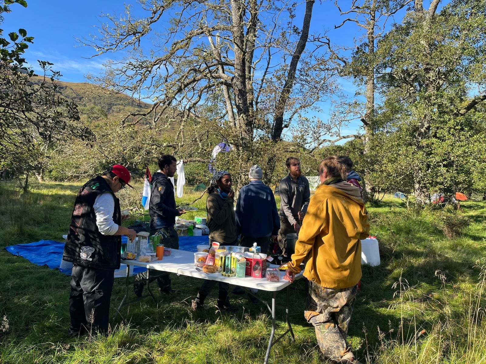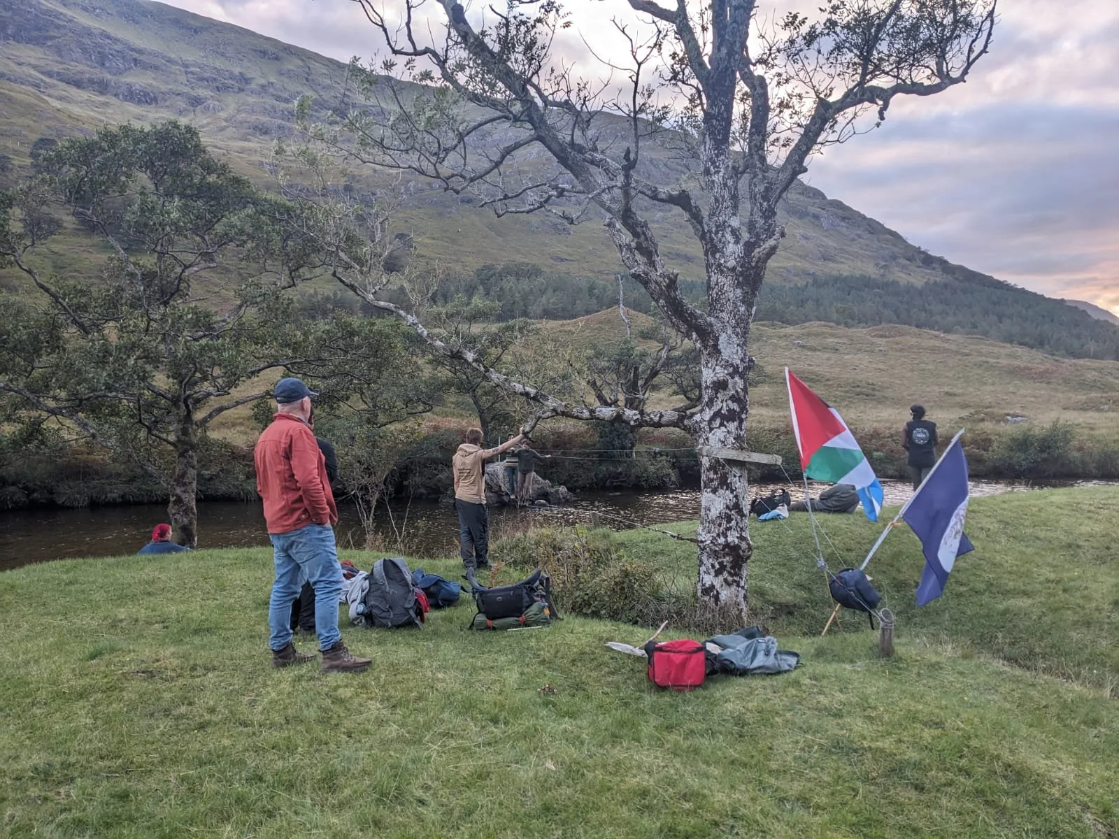 In the morning we enter a day of banner making creativity, of washing in the river, of sitting in the sunshine under the trees, on a tarp where possible because of the zillion ticks.