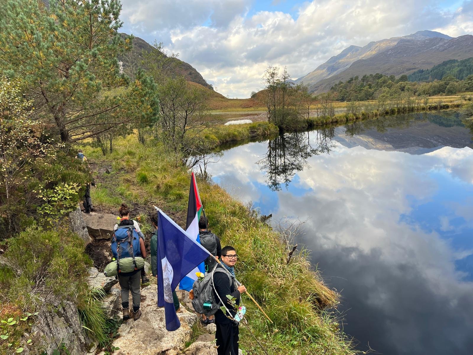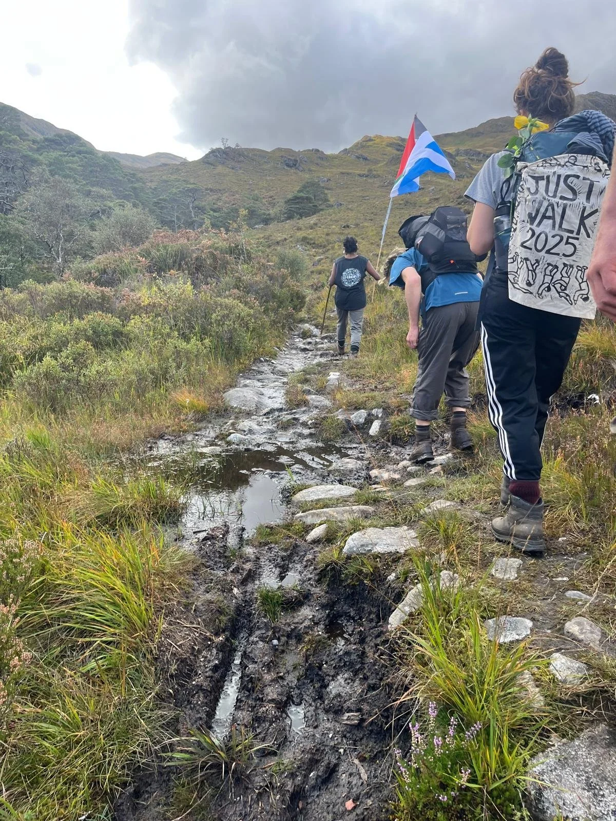 In the gift shop they give us free coffees because we’ve arrived and will leave on foot, and one of those working there voices strong appreciation for the Palestine/ Scotland flag.