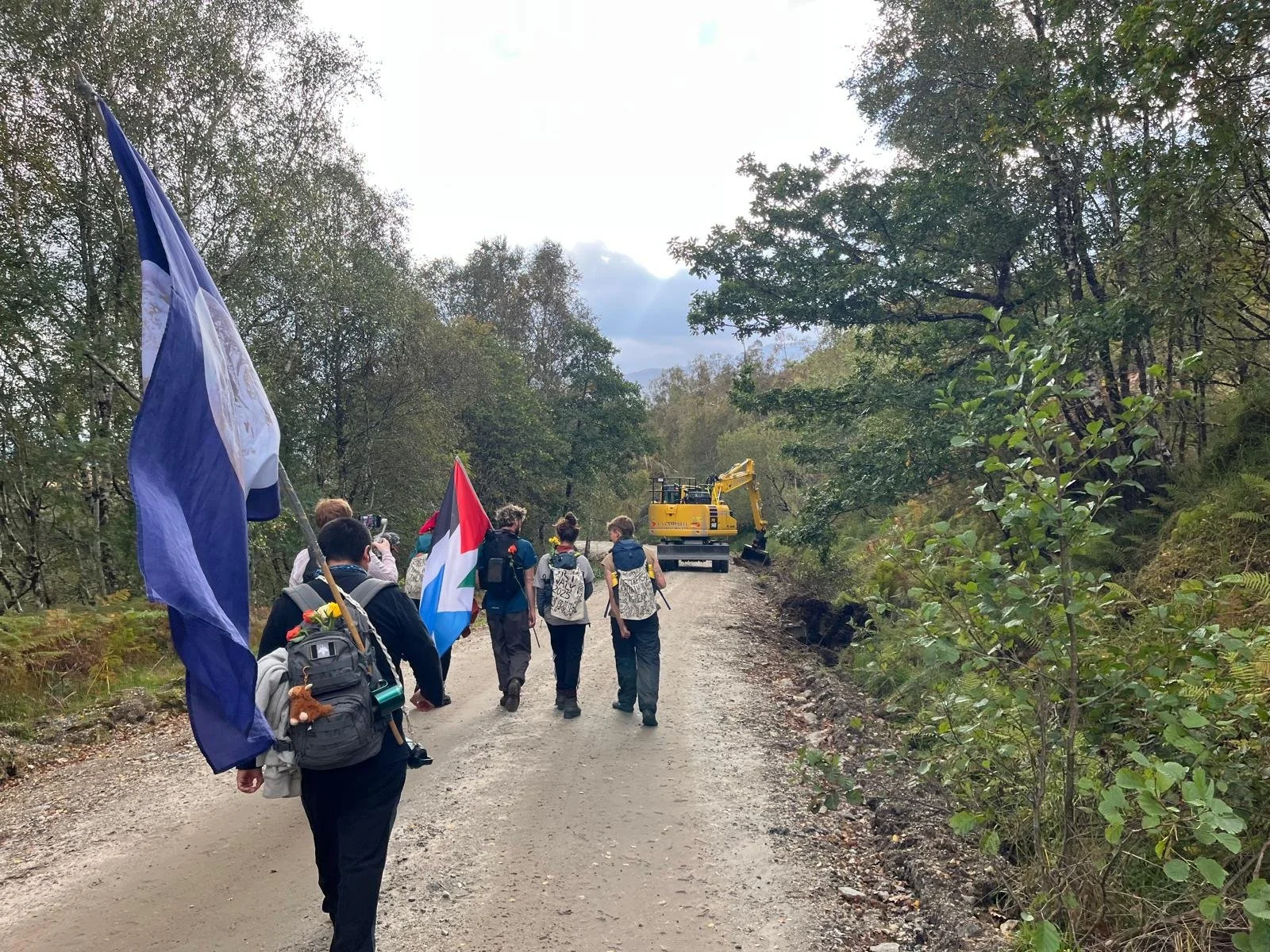We meet guys in two big caterpillar trucks digging the drainage diches by the side of the logging road we are walking. When I tell one of them we are walking because the land needs to come back to the communities and people, he says “I can’t argue with that”.