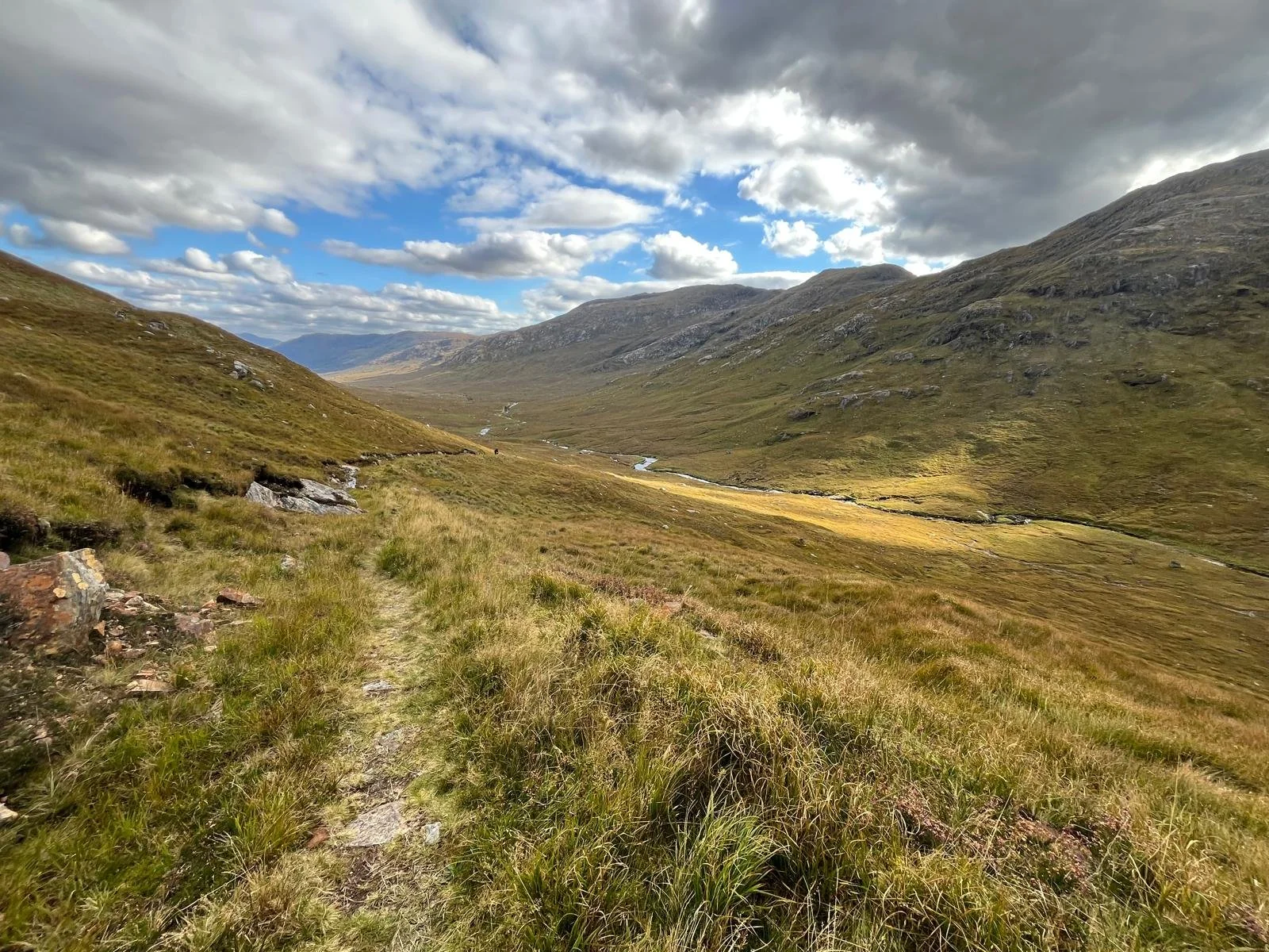 We pause to eat our lunch sandwiches before reaching the pass at the top of the Glen. Ben suggests that from there we have the 20 minute walk in silence. He suggests we end it with a minute of silence together. He thinks that Cona Glen means glen of wolves. After the 20 minutes, and then the minute’s silence, we are over the pass and into a vast landscape where the mountains sweeps round like a giant amphitheatre to our right, and there is a track to our left that we follow around a curve until we are descending towards the river snaking acoss the moorland below.