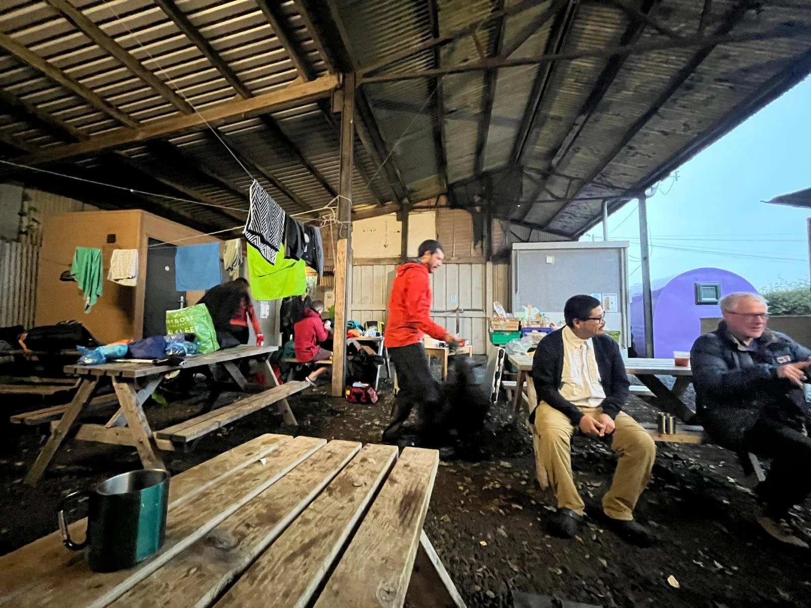 Finally we curve through the paths that wend between the spaced out huts to get in out of the rain into the community hut where wonderful hot food awaits us and we scuttle to retrieve bowls and places from our rucksacks piled up sodden and dank in the vans. Tonight there is not need for us to get the gas burners out to cook.