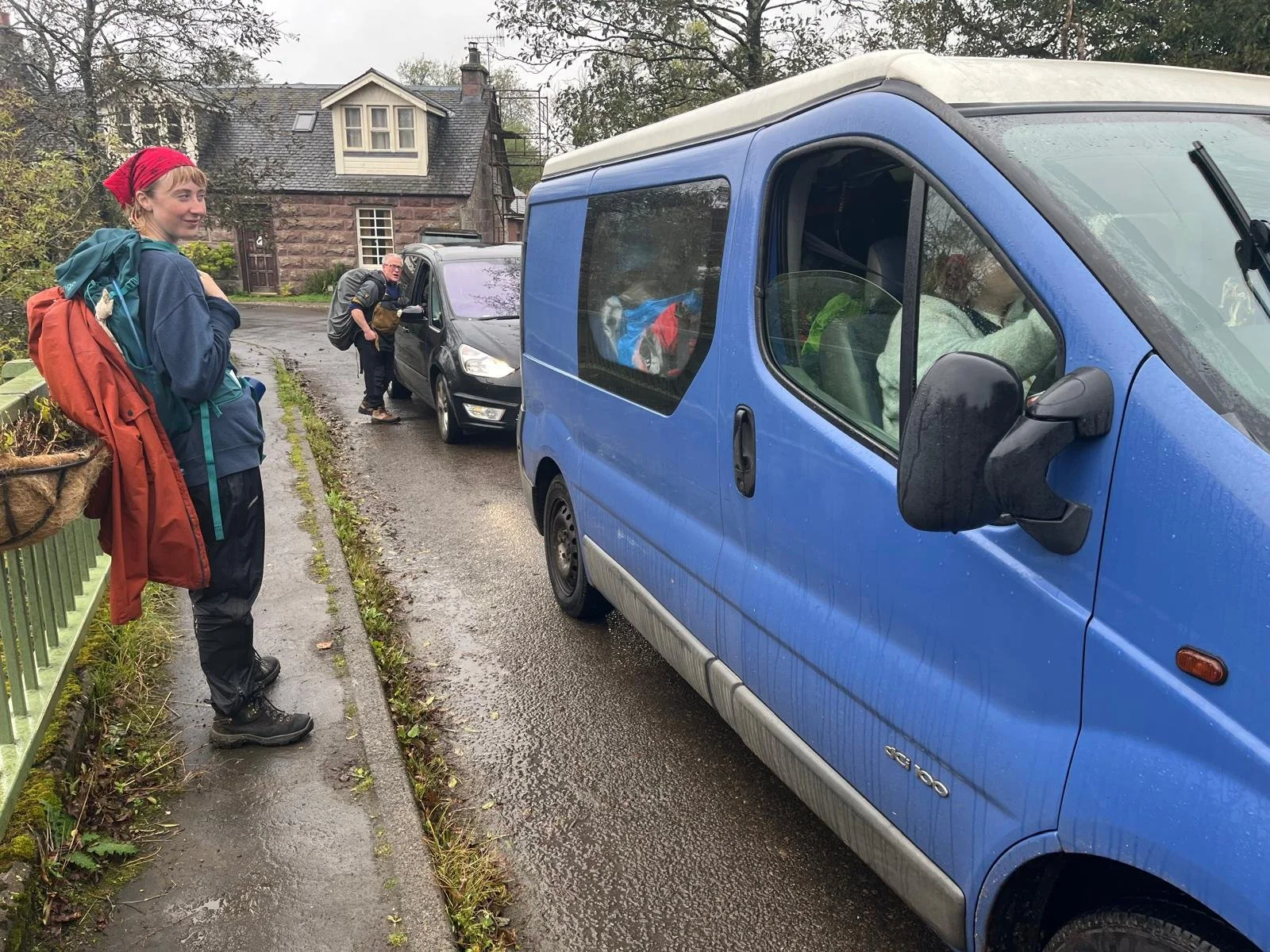 A bunch of us are driven from the overnight campsite at Dryman back to Balmaha by Loch Lomond, where w’d en did our walk the evening before.